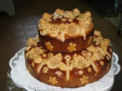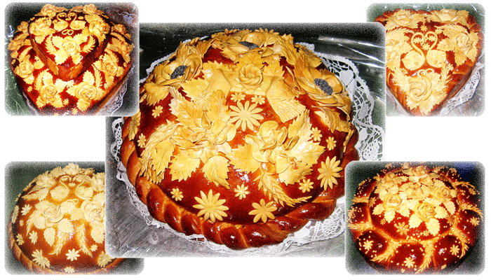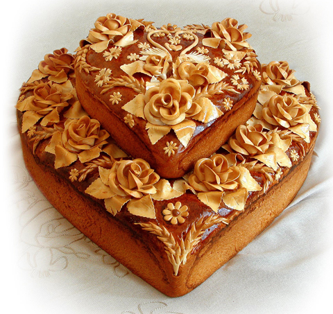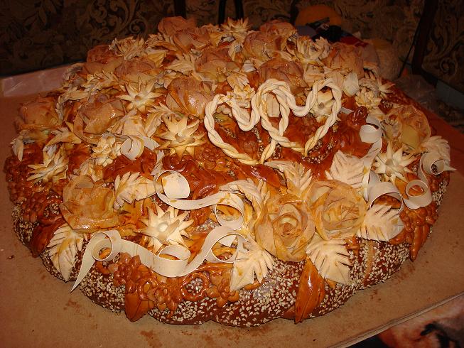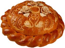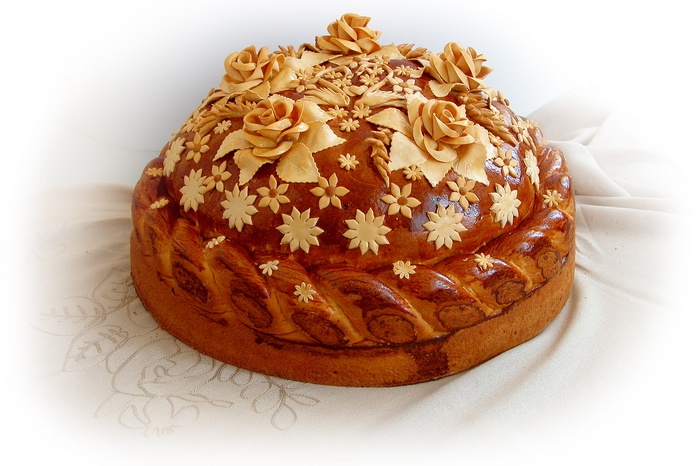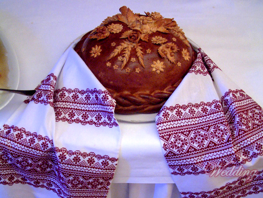 Каравай считался символом счастья, достатка и изобилия. Каравай выносили на рушнике — расшитом полотенце. Чем пышнее выпечен каравай, тем счастливее и богаче станут отведавшие его молодожёны. Каравай был многослойным, и делил его крёстный отец жениха или невесты. Верхушку отдавали молодым, среднюю часть — гостям, а низ, в который часто запекали монеты, — музыкантам. Вместе с кусочком каравая молодые делились с гостями своим счастьем. Гости в ответ благодарили жениха и невесту подарками.